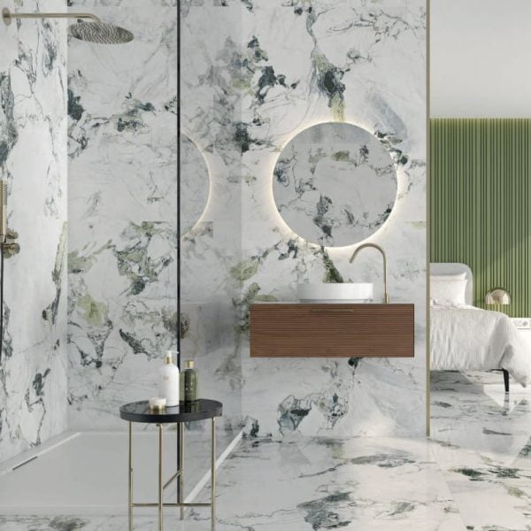 Sublime expression de la pierre naturelle avec la richesse d’un veinage multicolore et aléatoire décliné dans de majestueuses dalles de format 120×120 (existe aussi en format 60×120). Photographie réalisée avec le coloris Green seaweed.