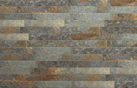 Inspiration ardoise naturelle oxydée, sciée en lamelles de format 10x60x ep. 9mm. Les lames en grès cérames pleinement vitrifiées présentent toutes les façons du travail de la pierre : lisse, éclatée, sciée, bouchardée, martelée, …